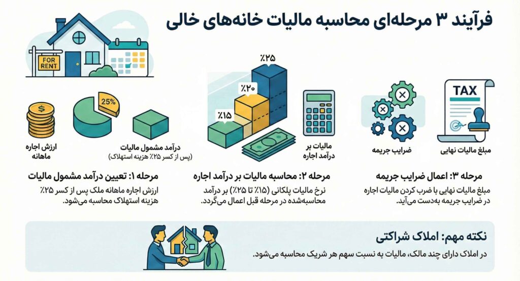 محاسبه نرخ مالیات خانه خالی فرایندی چندمرحلهای است که براساس «ارزش اجاری ملک» و «مدتزمان خالیبودن» انجام میشود. مراحل آن بهشرح زیر است: