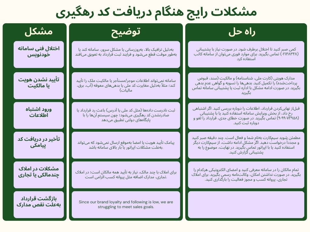 | ورود اشتباه اطلاعات | ثبت نادرست دادهها (مثل کد ملی یا آدرس) باعث رد قرارداد یا صادرنشدن کد رهگیری میشود؛ چون سیستم آنها را با پایگاههای دولتی تطبیق میدهد. | قبلاز نهاییکردن قرارداد، اطلاعات را دوباره بررسی کنید. اگر اشتباهی رخ داد، از بخش ویرایش سامانه استفاده کنید یا با پشتیبانی (۹۰۹۹۰۷۲۹۵۸) تماس بگیرید. در صورت خطای جدی، قرارداد را لغو و دوباره ثبت کنید. |