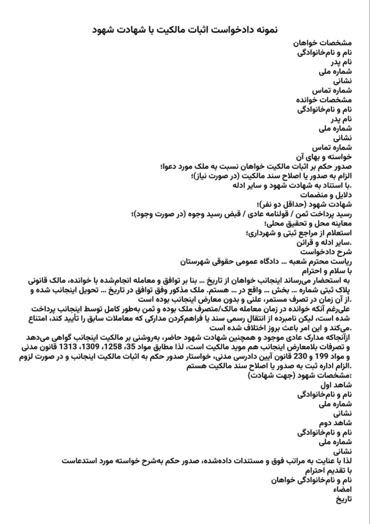 یک نمونه استاندارد از متن دادخواست اثبات مالکیت با استناد به شهادت شهود میتواند بهصورت زیر باشد: